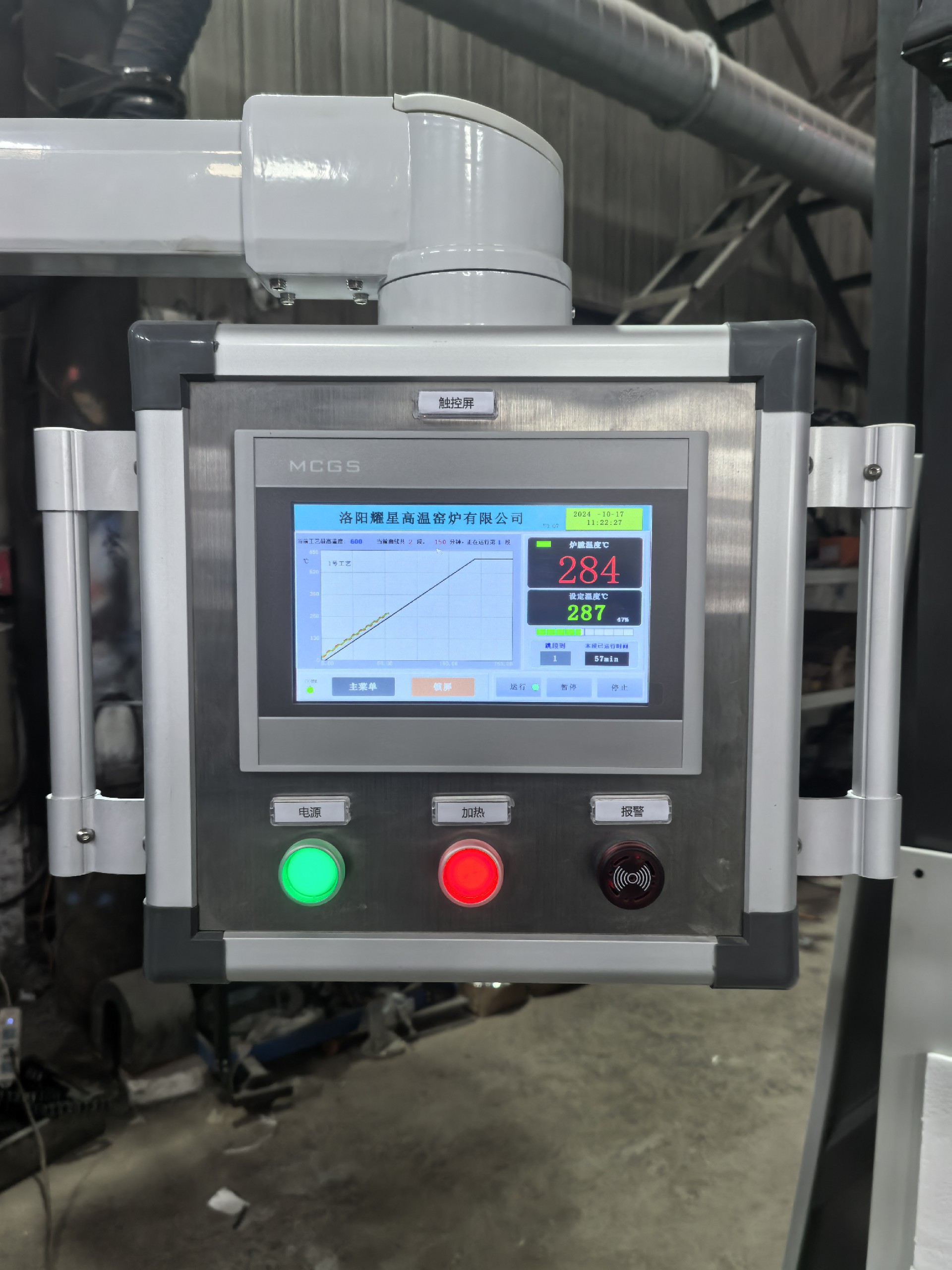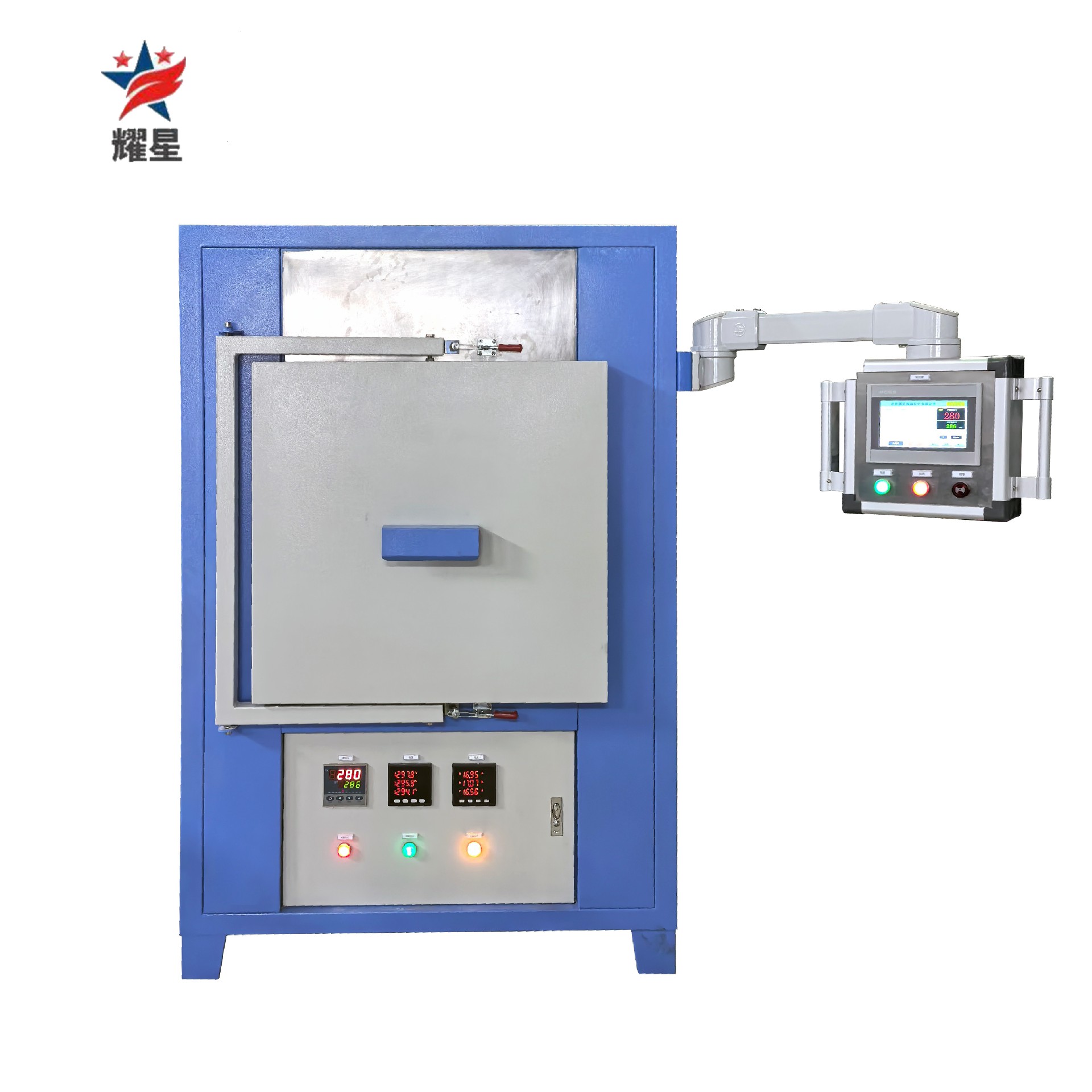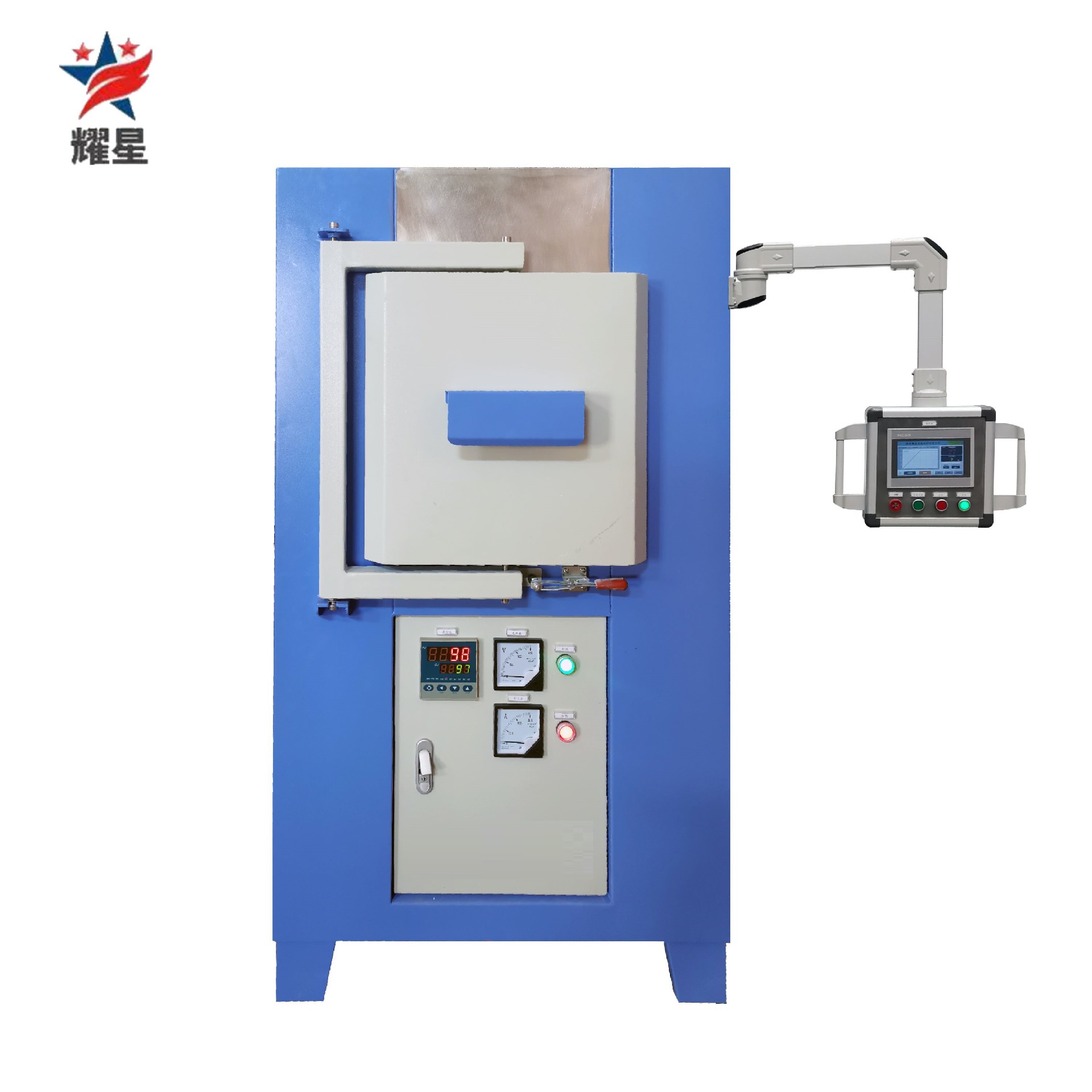 結構形式:上部為加熱爐體,下部為控制系統(tǒng),爐體側部安裝支架帶觸摸屏。